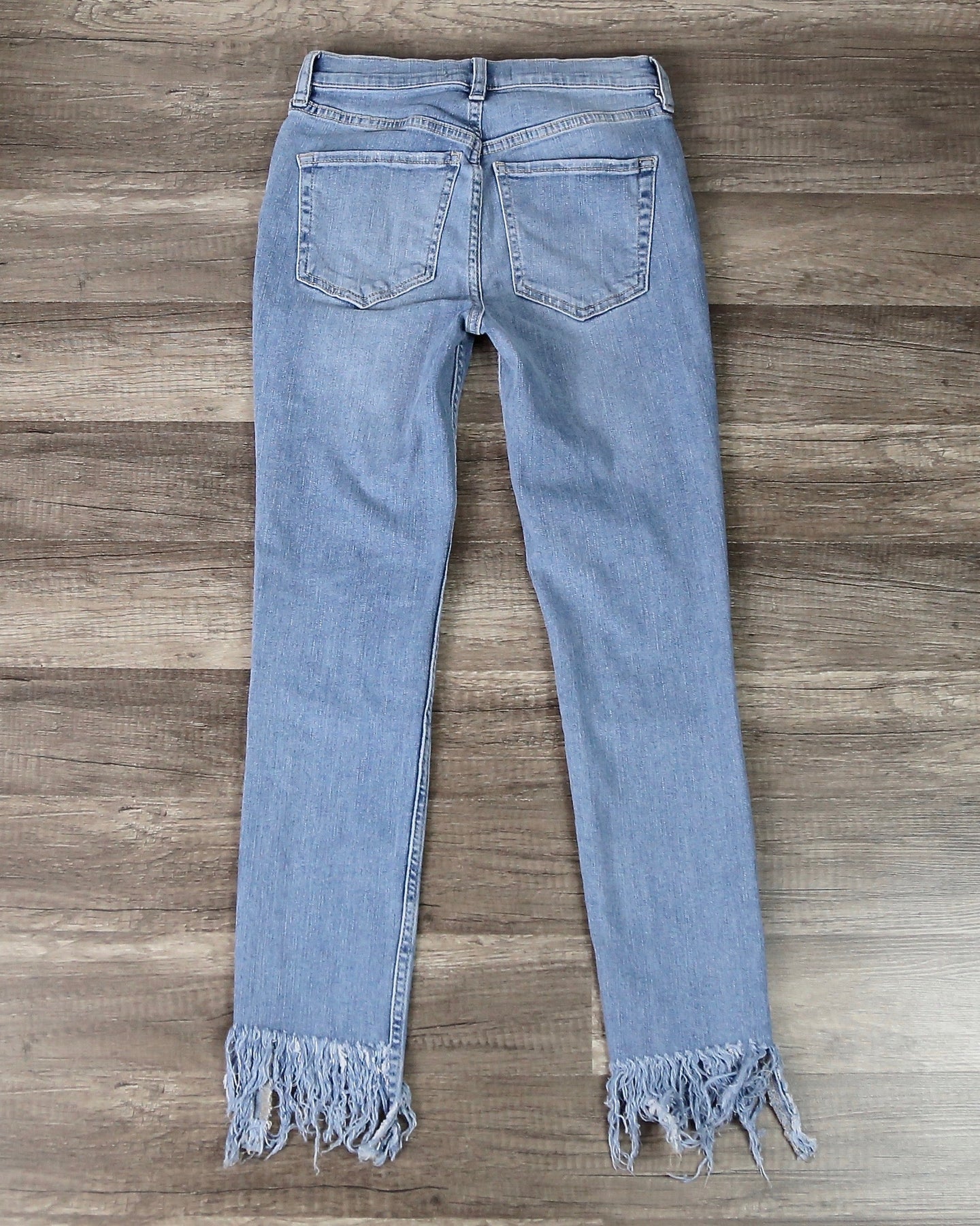 Super stretchy mid rise skinnies featuring busted out knees and raw edges. Five-pocket style with a button closure and zip fly.