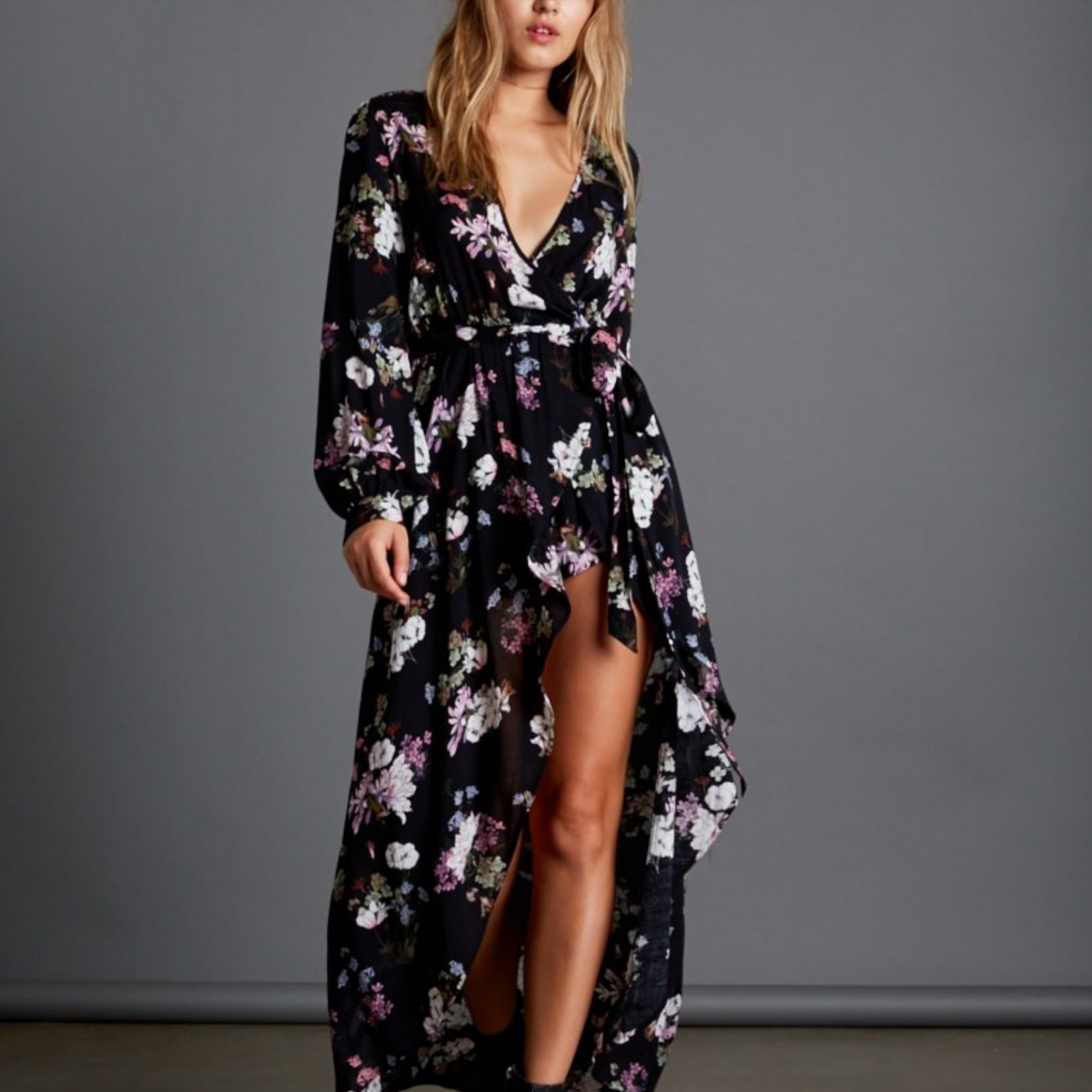 Long sleeves, faux wrap dress featuring maxi skirt over shorts. Imported.