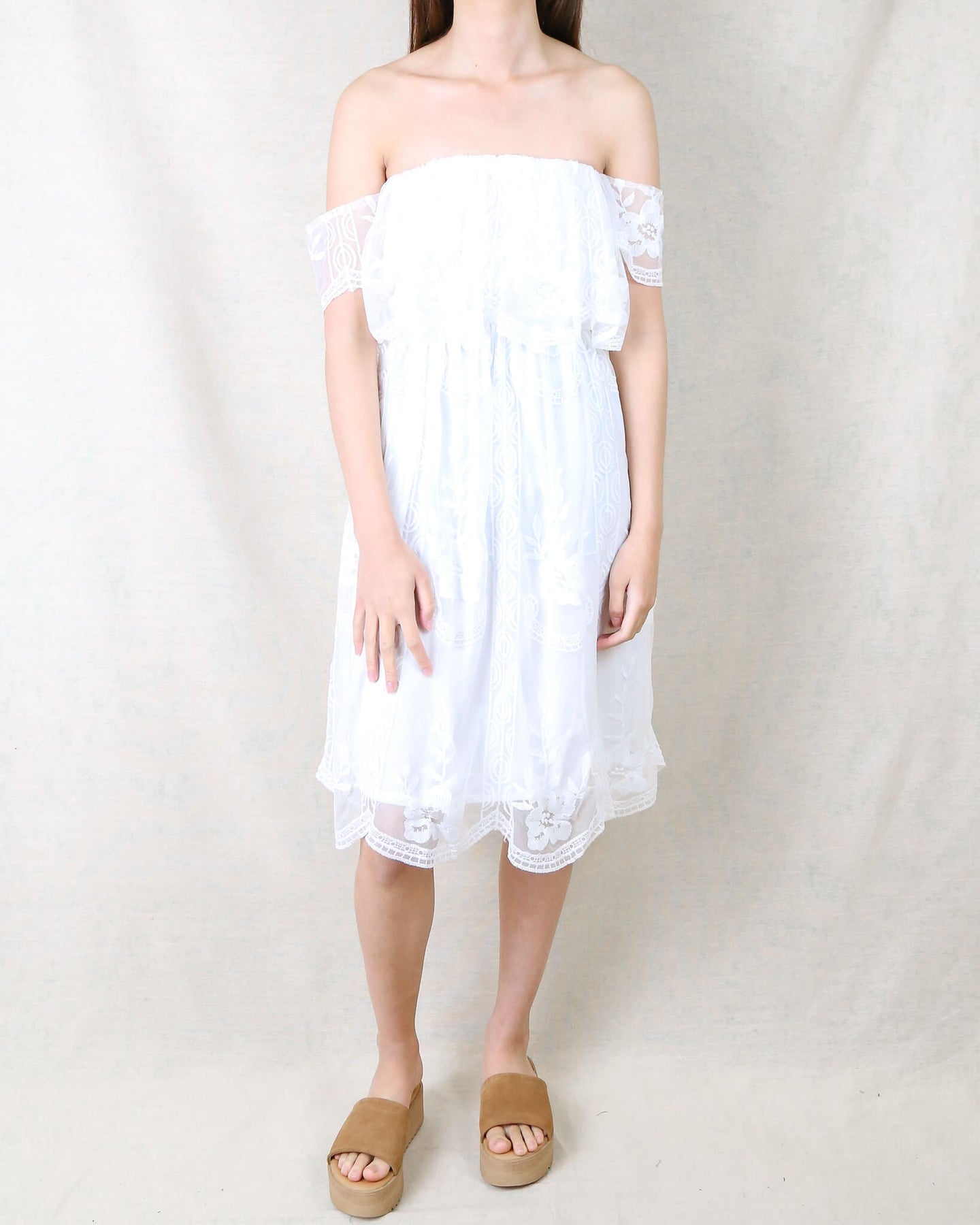 Reverse - Downtown Abby Off The Shoulder Embroidered Midi Lace Dress in White