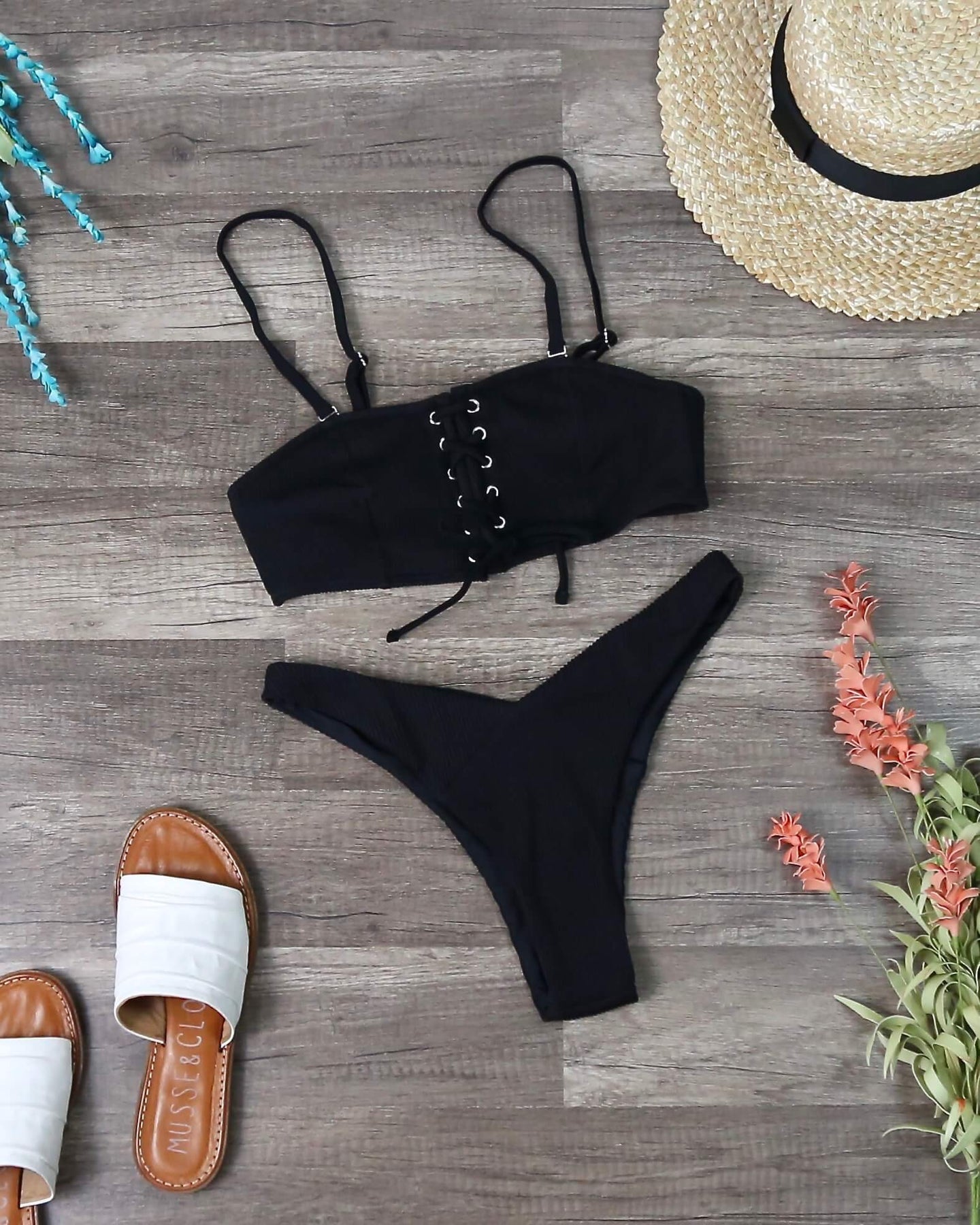 Black ribbed bandeau lace-up bikini top or ribbed bottoms