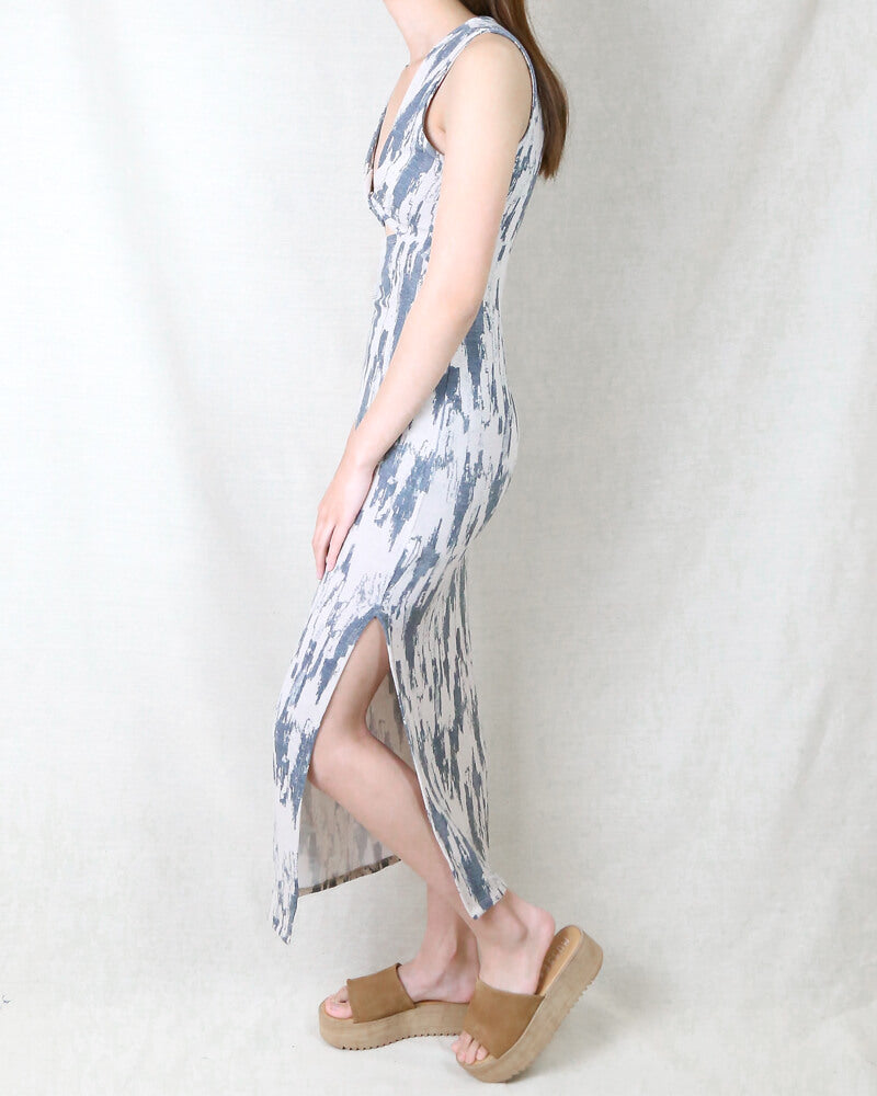 Tessa Tie Dye Cut Out Printed Midi Dress in Taupe Charcoal